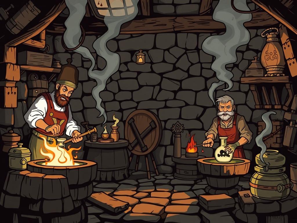 Оба мастера опираются на контроль температуры и времени, но манипулируют материалами по-разному: кузнец формует и закаливает, алхимик ищет трансформацию состава и структуры вещества.